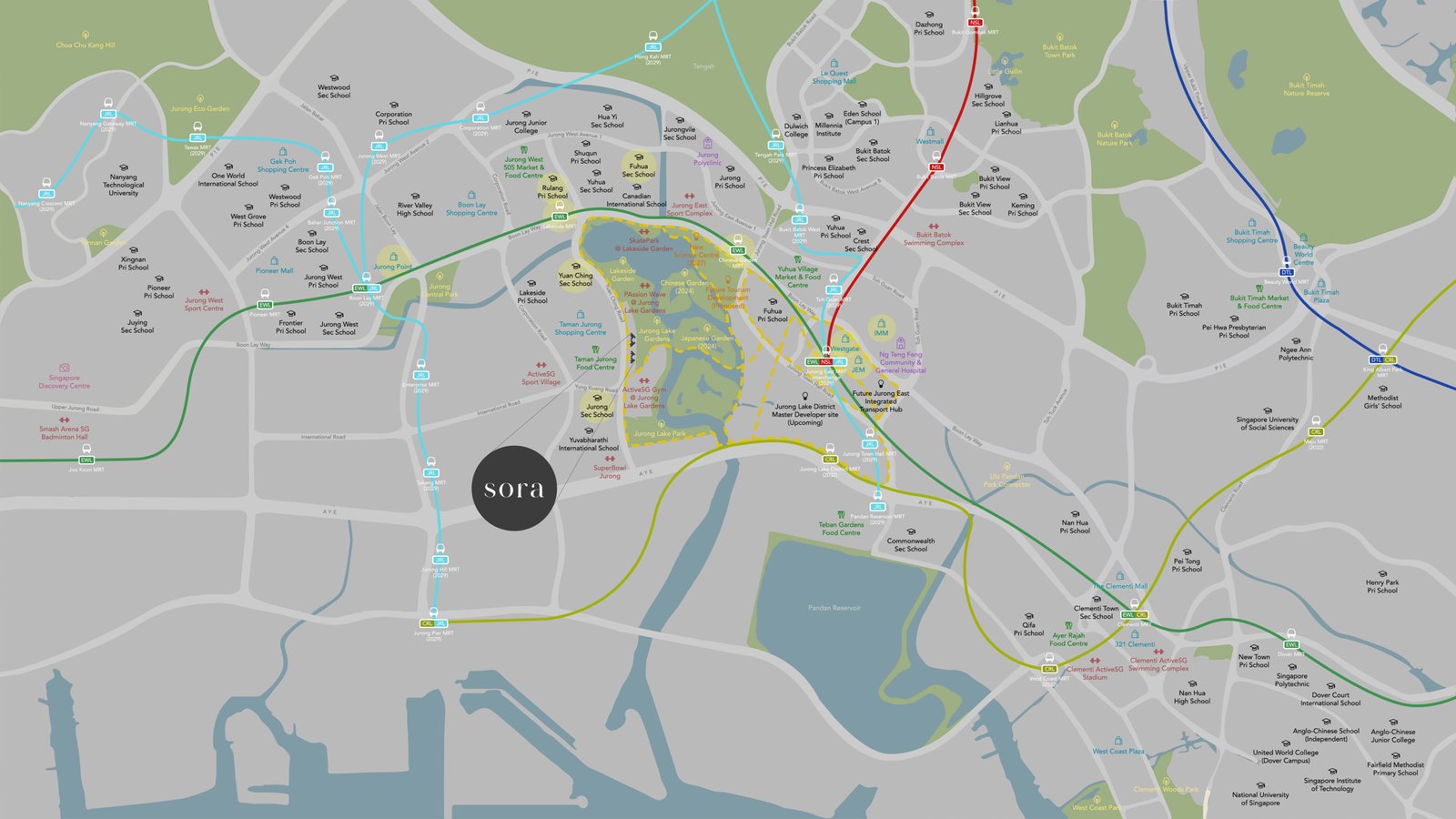 • Jurong East MRT Interchange (EWL, NSL, JRL – 2029) – 7 mins drive
